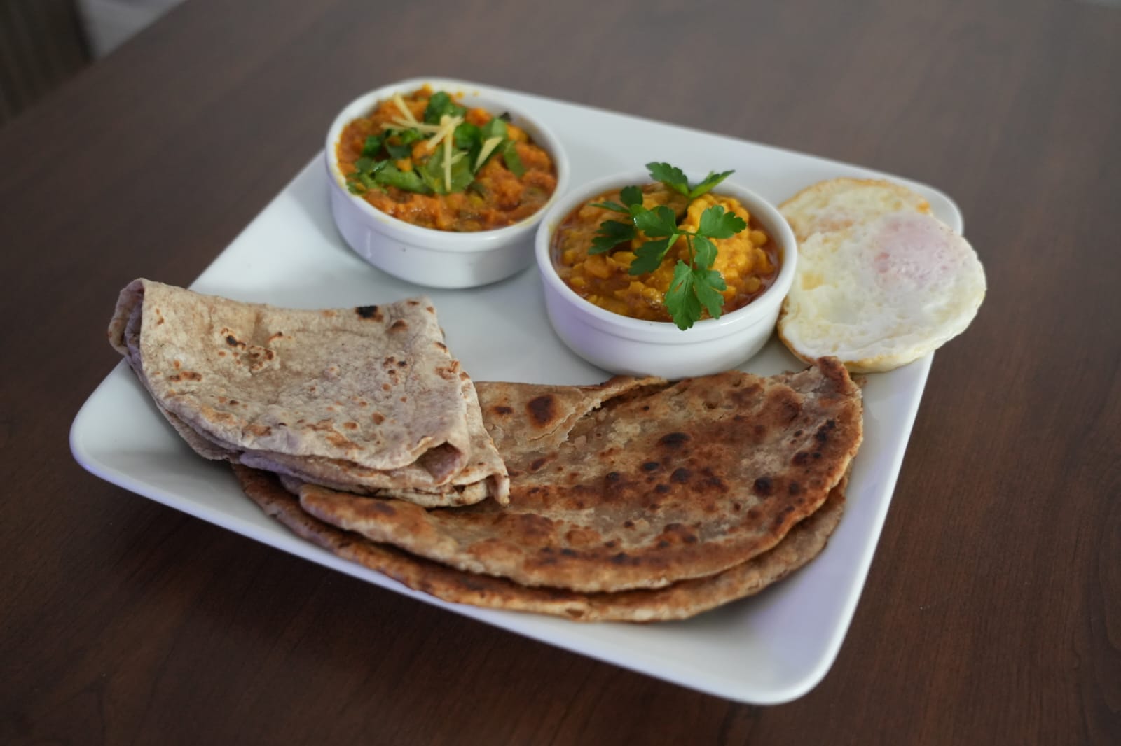 2 Eggs, 1 Veggie/Vegan Sausage, 2 Hash Browns, Mushrooms, Beans, Tomatoes